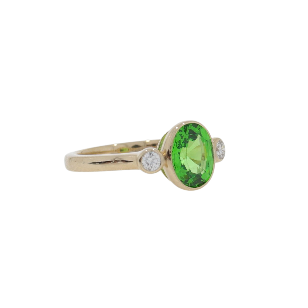 The oval Tsavorite garnet is mounted with a single diamond to either side. All three stones are set in an 18ct rose gold rubover mount. The ring has a uniform D shape shank with solid shoulders at the head of the ring. Inside the shank there is a traditionally struck hallmark and the weights of the stones are also punched inside.